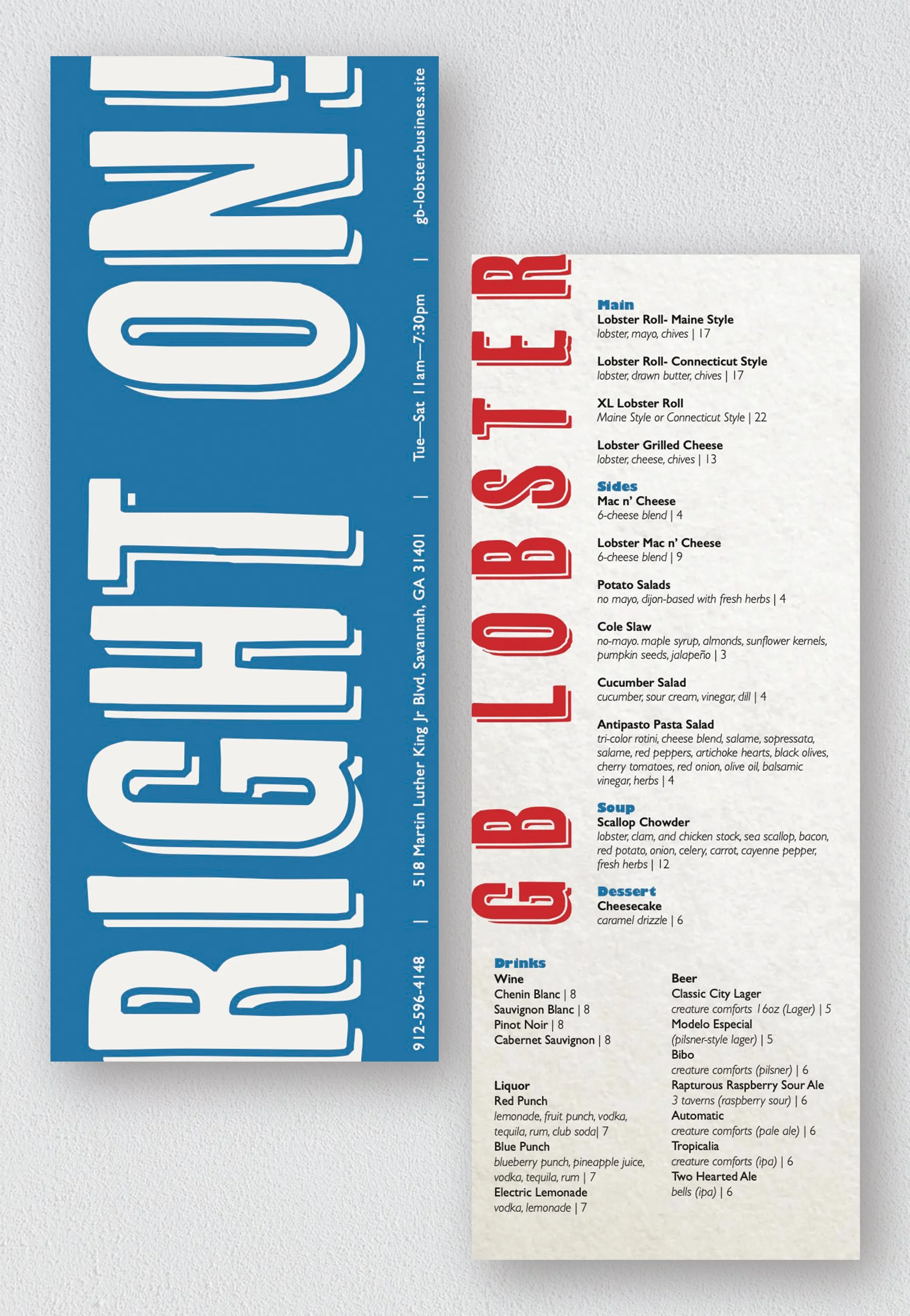 Anthony is a veteran who served sweet freedom for our country and now he is serving delicious lobster rolls to Savannah. The color pallet is patriotic and nautical in honor of Anthony’s story. While meeting with him, I caught onto his favorite catch phrase, “right on”, and incorporated it into my designs. Ghost Buster the poodle and GB Lobster’s mascot is also an important design element throughout the branding. Whimsical details can be found throughout, such as the to-go bags that resemble someone “walking” Ghost Buster the poodle or holding onto a lobster’s claw.